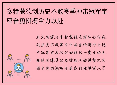 本文将探讨多特蒙德足球队如何在创历史不败赛季中奋勇拼搏,冲击德甲冠军宝座。通过回顾这一赛季的关键时刻、球员的表现、战术的调整以及俱乐部的战略布局,我们能够深入了解这支年轻而充满活力的球队如何在德甲赛场上展现出不屈的精神和强大的实力。文章将从四个方面进行详细阐述:一是球队的整体战术体系,二是核心球员的突出表现,三是关键比赛中的决胜时刻,四是俱乐部管理层的支持与决策。通过这些方面的分析,文章将呈现出多特蒙德如何在挑战中全力以赴、逐步接近顶峰,并为球迷们呈现了一场激情澎湃的冠军之旅。